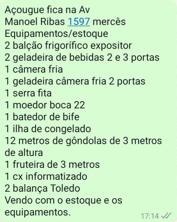 Vendo açougue no bairro Mercês, localizado na Avenida Manoel Ribas.